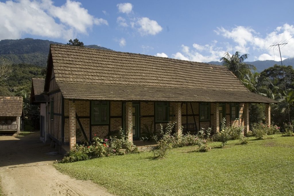 Descrição: Nos tombamentos Estaduais na região de ocupação teuto-brasileira temos a arquitetura enxaimel figurando no cenário rural, representados pela residência do colono isolada no lote ou por conjuntos comerciais, antigos pontos de parada de rotas comerciais. São, na sua grande maioria, exemplares com estrutura de madeira, em fechamento de tijolos aparentes, sendo comum a formação de desenhos na disposição dos tijolos. Excepcionalmente, nos casos mais antigos, os fechamentos se davam em taipa de mão rebocada. As edificações residenciais possuem grandes inclinações de telhado, disposto em duas águas que cobriam três áreas distintas, varanda frontal, corpo principal e cozinha aos fundos. Estas formam conjuntos com outras unidades de serviço como paiol, estábulos e estufas, sob ranchos de madeira com tratamento rústico e extensos telhados. Estes exemplares encontram-se muito bem representados no município de Pomerode.